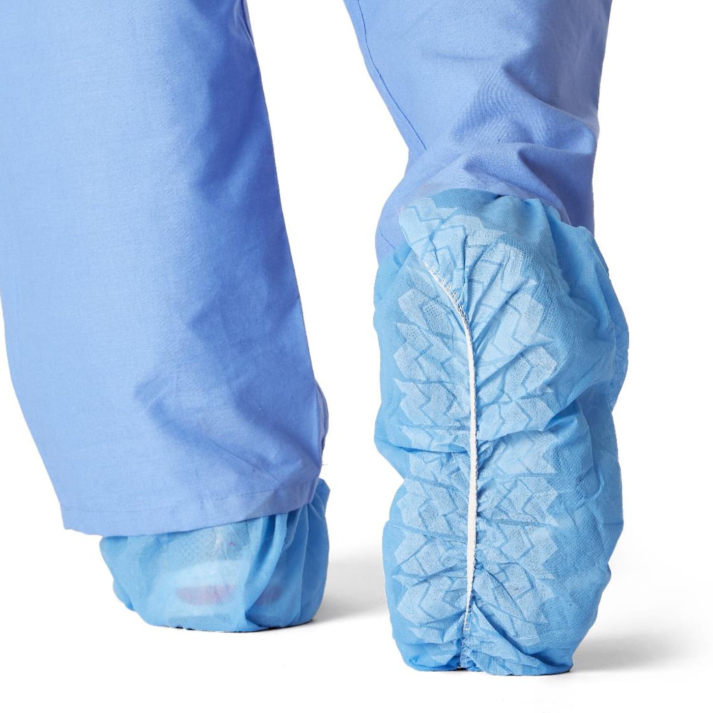 Blue, slip-on shoe covers have a surged seam and nonskid bottoms for greater traction